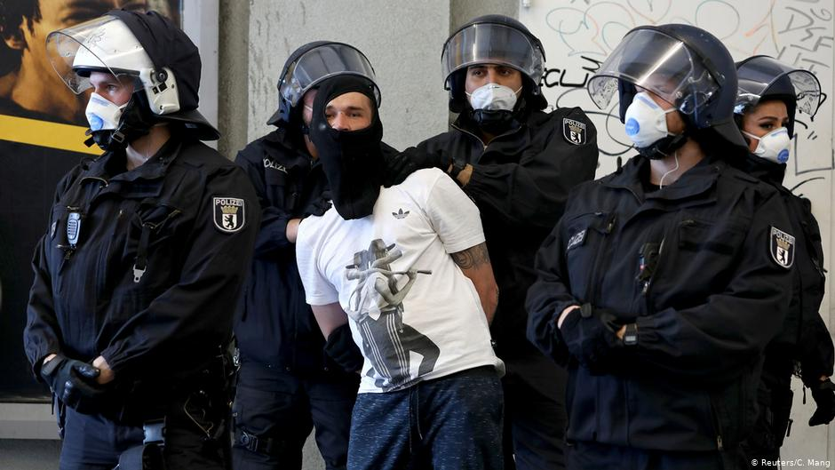 周六柏林一抗议者被捕(图源:Reuters)
